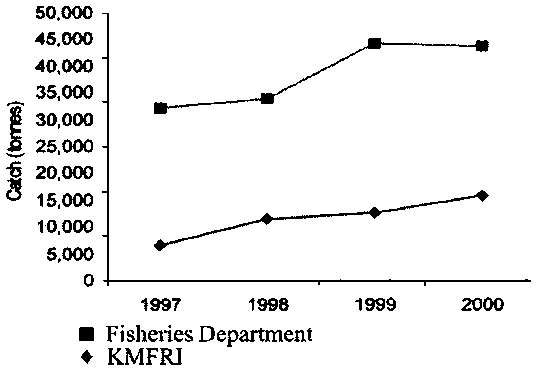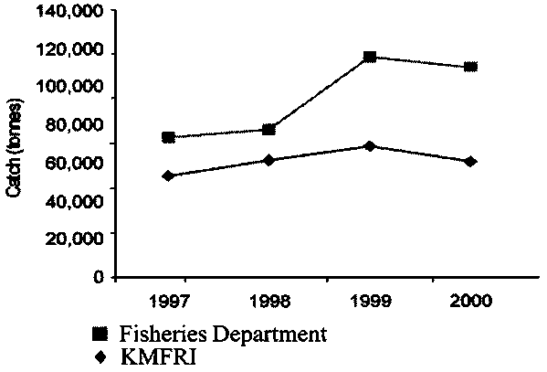 This is what happened in Tanzania, where the researcher lacked motivation and the quality of the output was weaker, despite intense supervision. Involvement of local fishing communities could help resolve this problem. The poor conformity of the processing factory data were because the EU imposed an export ban on Nile perch into Europe for most of 2000 because of problems with fish poisoning and the factories were operating at very low throughput (Fig. 5).