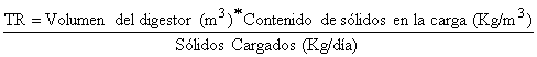 Tiempo de Retención: La velocidad de degradación depende en gran parte de la temperatura, pues a mayor temperatura el tiempo de retención requerido es menor. Para un digestor batch el tiempo de retención es el tiempo que transcurre entre la carga y descarga del sistema; para un digestor continuo, el tiempo de retención determina el volumen diario de carga, según la relación:
