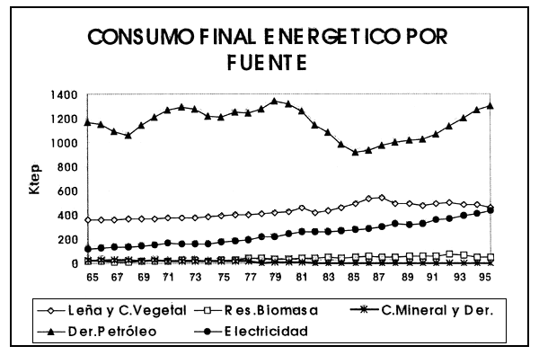 Como muestra el cuadro l, el energético mas importante en la matriz nacional es el petróleo que presenta un 58.2% de participación, leña y biomasa con 22.5% e hidroelectricidad con un 19.3%. En los últimos 20 años se observa una participación decreciente del uso de derivados del petróleo que pasa del 68.8% a 58,2% lo que implica una disminución de divisas ya que en su totalidad es importado.