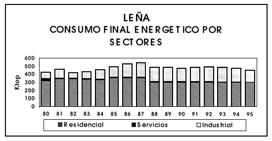 El consumo de leña y derivados, desagregado por sectores, para 1995 se muestra en el gráfico siguiente.