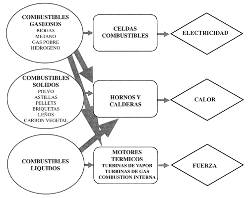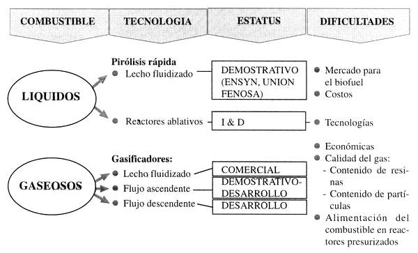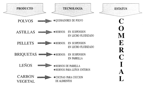 A continuación se muestra por medio de esquemas la situación actual de las tecnologías comerciales y en desarrollo, dirigidas al uso de la biomasa como combustible.