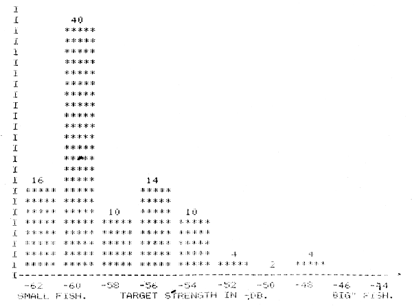 | TS(DB): | ECHO-NUMBER: | VOLUME DENSITY, FISH/1000 M**3: | AREA DENSITY, FISH/HECTARE: | TR VAL: | TS VAL: |
