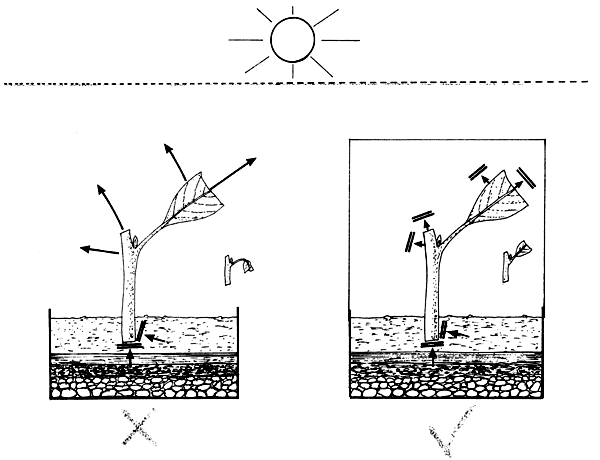 No. As with germinating seeds (Manual 2), shading is used to protect the young plants at a critical stage. Later on, when their root systems have developed, shading is progressively reduced so that the plant becomes ‘hardened’ to full sun (A 54).