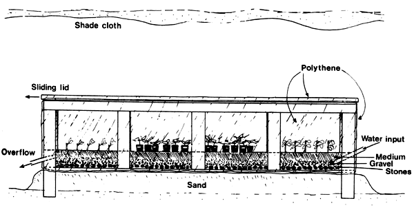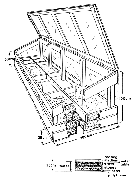 It is built with a simple frame covered with clear (or white) polythene sheeting, and contains a reserve of water below a moist rooting medium (A 31).