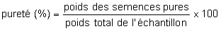 Par semences pures, on entend les semences de l'espèce considérée, c'est-à-dire les graines mûres intactes, mais aussi les graines de taille inférieure à la normale, ratatinées, immatures ou germées, dans la mesure où leur appartenance à l'espèce considérée peut être établie avec certitude, ainsi que les fragments de graines d'une taille supérieure à la moitié de la taille initiale des semences (ISTA, 1976). Les graines de légumineuses et de conifères ayant entièrement perdu leur tégument sont considérées comme de la matière inerte. Outre ces semences pures, un échantillon peut contenir d'autres graines de toutes les espèces, sauf celle qui est à l'essai, et de la matière inerte. Cette matière est constituée de fragments de graines cassées ou endommagées d'une taille inférieure à la moitié de la taille originale, d'ailes de conifères, de graines de légumineuses et de conifères ayant perdu leur tégument et d'autres matières telles que morceaux de feuilles, brindilles, cailloux, terre. En ce qui concerne les conifères (à l'exception de Chamaecyparis, Cupressus et Thuja), toute aile ou partie d'aile encore attachée à la graine doit être détachée et classée comme matière inerte.