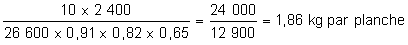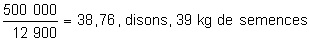 En utilisant les données de l'exemple précédent (26 600 semences pures/kg, degré de pureté de 91 pour cent, soit 0,91, pourcentage de germination de 82 pour cent, soit 0,82, et facteur de récupération en pépinière de 65 pour cent, soit 0,65) et en supposant que la norme de récupération de plants est de 15 000/kg, on obtient: