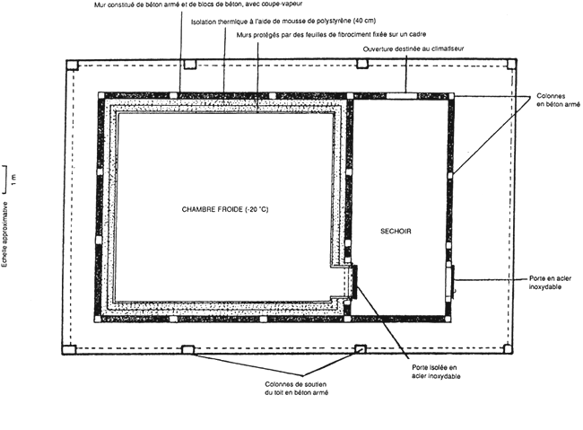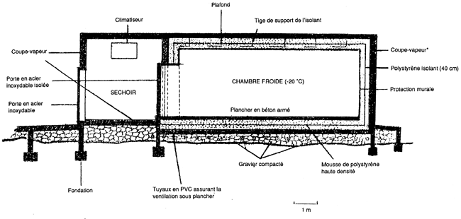 Isolation thermique: on utilise de la mousse de polystyrène ordinaire pour isoler les murs et le plafond de la chambre froide et du polystyrène haute densité pour isoler le plancher. Pour les murs et le plafond, on emploie des feuilles de 40 cm d'épaisseur (1,2 × 2,4 m) coupées de manière à ménager un chevauchement d'au moins 20 cm sur tous les côtés. Les feuilles sont maintenues en place par des fils métalliques fixés aux murs et aussi par un treillis en bois placé à l'intérieur. En ce qui concerne l'isolation du plafond, des tiges de fer recourbées sont enfoncées dans le Styrofoam (épais d'au moins 40 cm) et accrochées à l'armature du plafond. Quant au plancher, il est isolé par deux couches de Styrofoam haute densité épaisses de 20 cm, avec un chevauchement de 20 cm.
