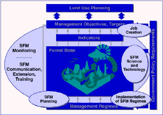 The inputs to the framework include resource inventories, land use planning, silviculture, forest health, ecosystem management planning, job creation and monitoring and adaptive management. All of these components have linkages to SFM planning, SFM Science and Technology (S&T), implementation of SFM regimes, SFM monitoring, SFM communications, extension, training and job creation. It is obvious that forestry schools play a critical part in many of these components.