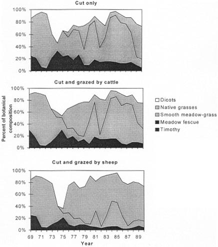 One cut for silage combined with sheep or cattle grazing are common practices among farmers in northern Norway, but a proportion of the grassland area under cultivation is only cut. The species composition over time may be different in swards affected by grazing compared with those only cut for conservation, and this has implications for the amount and quality of herbage produced (Nesheim, 1994; Pestalozzi, 1987; Smith and Rushton, 1994).