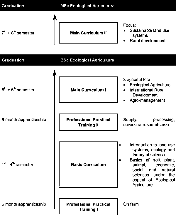 The fifth and sixth semesters are focussed on specialization either into Ecological Agriculture, International Rural Development or Agro-management. Within the first topic their is a structure of course blocks, which corresponds to a consecutive sequence of all treated themes. Each semester contains two main blocks: soil and crops within the summer term, animal husbandry and socio-economy within the winter term. The conversion seminar is an essential course of the whole year, combining the knowledge of all disciplines, organized as student group work and dealing with existing farms so that a very high degree of practical relevance can be achieved. The third year has to be finished with a diploma thesis, which very often needs a further semester for completion and an oral examination. Students graduate with a BSc. which corresponds to an officially recognized degree for agrarian professions in Germany.