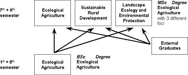Recently a two semester master course for Ecological Agriculture was implemented at the Faculty of Agronomy and International Rural Development. The MSc. graduation includes the qualification for a PhD study. The courses of the two semesters are more science oriented compared to the more applied focus of the third year. Actually there are two main areas: