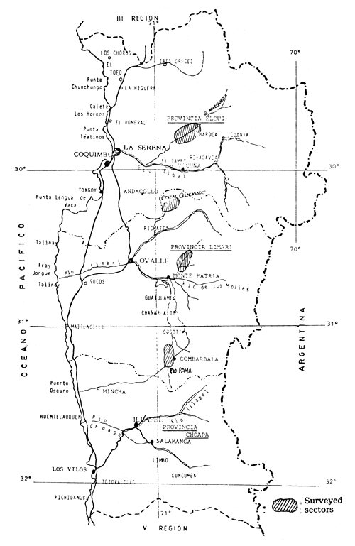 Sampling was carried out as a the second stage, including the delimitations of the above populations on Military Geographic Institute (IGM) charts, serving as a previous basis for subsequent populational charts.