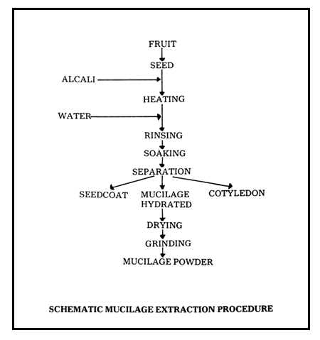 Mucilage was removed treating the seeds with 0.5% sodium hydroxide at 75° C for 4–10 min, and shaking. Alcali was subsequently washed off the seeds with drinking water, and then the seeds were left to soak for 24–48 h, changing the water periodically. Excess water was removed and the seedcoat, cotyledons and mucilage were separated. These components were heater-dried separately at 35° C. Mucilage was measured with a Thomas Wiley laboratory mill, mesh No. 60.