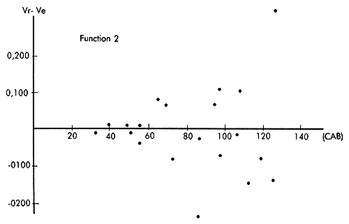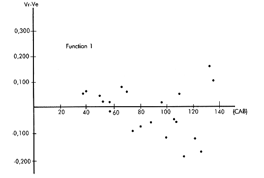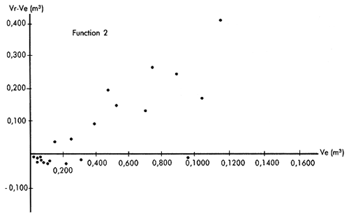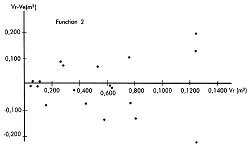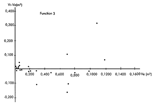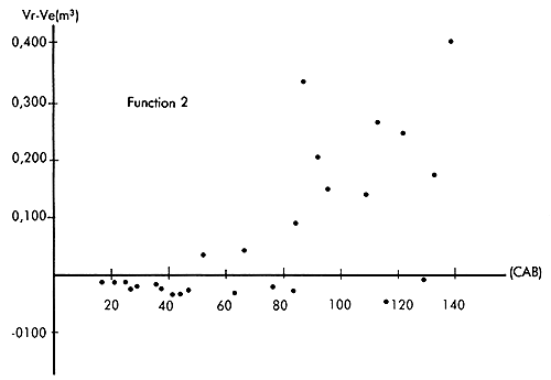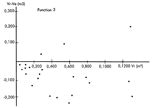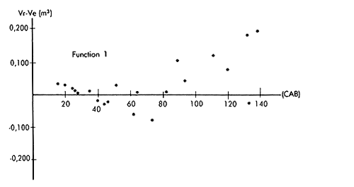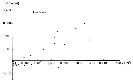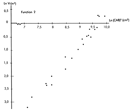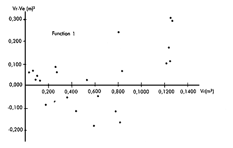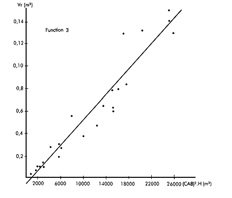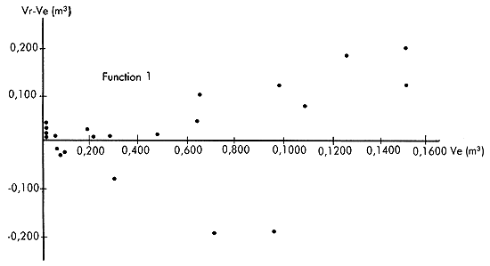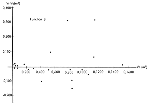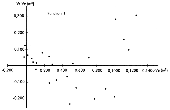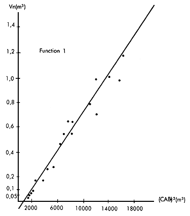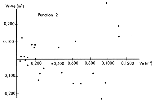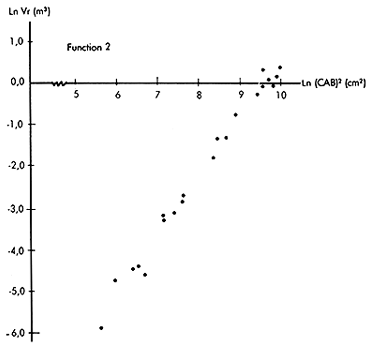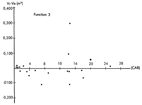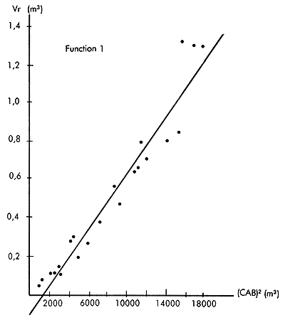 Consequently, the use of function V = -0.1101 + (cab)2 × 7.198 × 10-5 seems advisable, simpler to apply than the logarithmic function. The value of the Percentage Mean Residue for this function, namely 14.1%, indicates that the volume of individual trees so calculated must be taken as a preliminary estimate. However, volume estimate for a population made up by a large number of trees will show good approximation to the real volume of that population.
