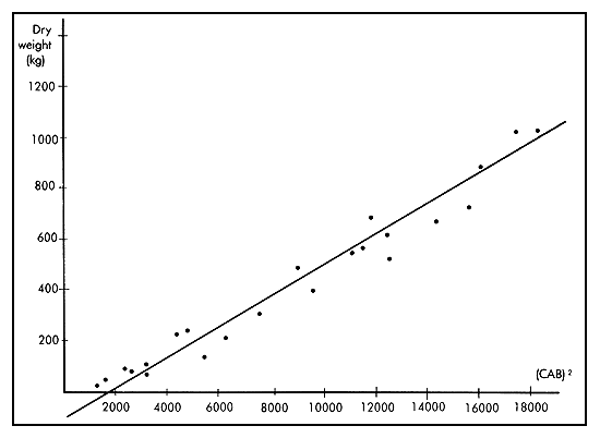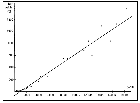 Considering that the best volume estimates were obtained by means of equations of the type V = a + b (cab)2, linear equations were determined for Total Dry Weight as a function of the same variable, with the following parameters: