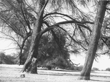 Au premier plan deux algarrobos (Prosopis chilensis Mol.) ayant poussé spontanément près de Canchones, Pampa del Tamarugal. Au fond tamarugos.