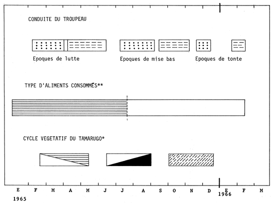 TABLEAU 26: Représentation graphique du cycle végétatif du tamarugo, de la conduite du troupeau ovin et de son alimentation au cours de l'année d'essai (1965–1966)***