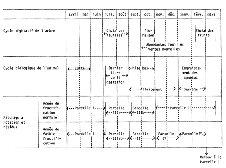 Oyarzún (1967) expose le plan de conduite dont il s'est servi pour des essais dans un boisement de tamarugo; on y voit une représentation graphique du cycle végétatif du tamarugo, de la conduite du troupeau et de son alimentation (tableau 26).
