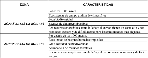 El consumo estimado de leña en Latinoamérica, como es el caso también de Bolivia, es de aproximadamente entre 750 a 900 kg. por persona por año. Existen también problemas con la deforestación en las tierras altas y ecosistemas tropicales. Los árboles no siempre compiten a la par con la agricultura. De todas maneras, desde que la energía de la leña utilizada por persona ha sido estimada en tres veces mayor que la energía consumida como alimento, esto será una presión enorme para las zonas más pobladas y escasas de estos recursos. Como en todas las regiones de mediano ingreso, al igual que en Bolivia la tendencia es la de reemplazar las leña por combustibles como el butano en garrafa de gas, a esto se suman las características favorables de la producción de Gas Natural del País.