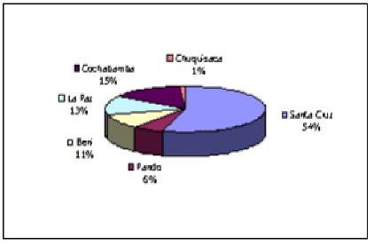 Los departamentos con mayor movimiento de créditos hacia el sector son: Santa Cruz con 1.01 millones de dólares; La Paz 0.78 millones y Cochabamba con 0.62 millones, siendo las cooperativas más importantes en Santa Cruz Jesús de Nazareno, San Martín y Fátima con 0.30 millones (29%), 0.21 millones (20%) y 0.22 millones (22%) respectivamente, en La Paz Los Andes con 0.56 millones (71%) y Financiacoop 0.22 millones (28%), en Cochabamba Loyola con 0.21 millones (34%) y Pío X con 0.17 millones (28%).En 1999 se tuvo 2.44 millones (91%) en cartera vigente, disminuyendo el primer semestre del 2000 a 2.39 millones (85%).