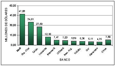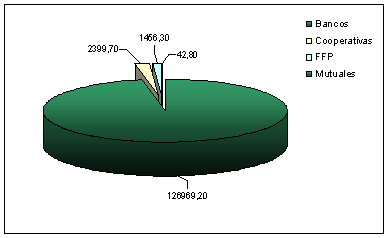 El siguiente gráfico muestra que la cooperativa con mayor movimiento de cartera es la Caja de Ahorro y Préstamo Los Andes con un monto de 0.875 (31%), seguida por Jesús de Nazareno 0.34 millones de dólares (12%).y con 0.329 millones (11%) Financiacoop.