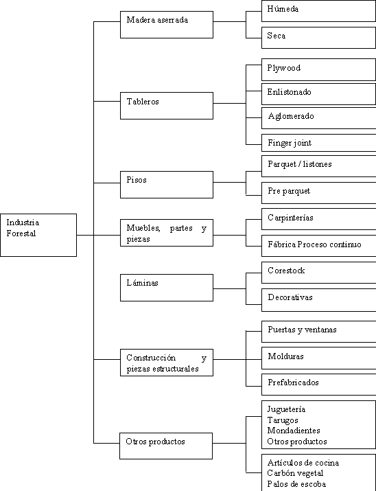 La industria forestal se desarrolla exclusivamente sobre la base de la madera de bosques nativos. Siete actividades son las que sustentan la industria: aserrío; tableros; pisos; chapas y láminas; muebles, partes y piezas; carpintería de obra y productos diversos de madera. Existe información sobre los costos de producción de madera aserrada, parquet, pisos, precios de los productos a nivel ex–fabrica y detallista, así como las tasas de conversión de madera rolliza por especies y tipos de productos. La producción anual de madera rolliza y la de los productos más importantes como madera aserrada, tableros y pisos, están normalmente disponibles por lo que se puede cuantificar su importancia económica.