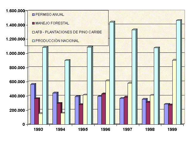 Las plantaciones de coníferas concretamente Pino Caribe (Pinus caribaea), se mencionan como ejemplo, dada la adaptabilidad de esta especie a las condiciones edafoclimáticas y a la considerable superficie, unas 600.000 ha, plantadas en el país.