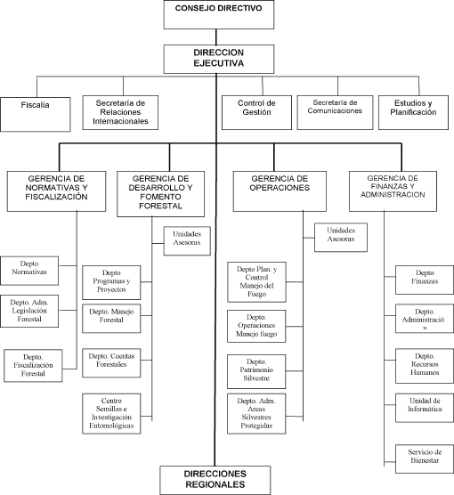 El staff profesional empleado considera Ingenieros Forestales, Técnicos Forestales, Médicos Veterinarios, Biólogos, Contadores, Abogados e Ingenieros Comerciales. El área de acción cubierta por la institución involucra a todo el territorio nacional, incluyendo el territorio insular. Para su funcionamiento cuenta con oficinas regionales (13) y provinciales (34) a lo largo de todo el país, encargadas de representar a la Corporación y ejecutar los programas dirigidos y coordinados a nivel central (Figura 1).