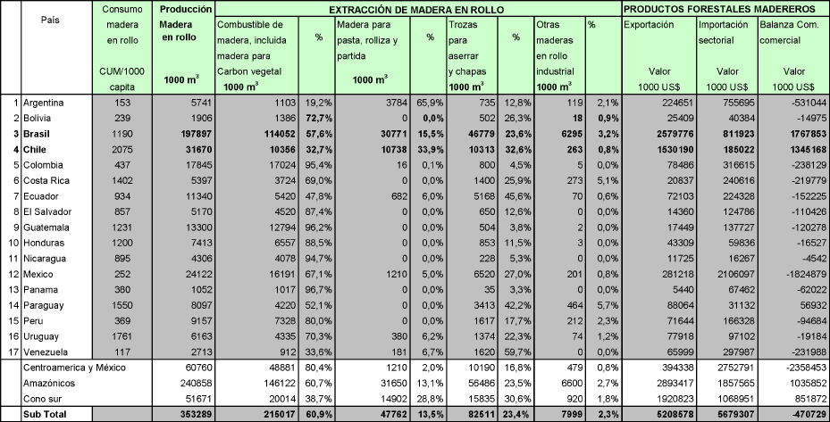 Para el citado año, el conjunto de países produjo un total de 353 millones de m3 de madera en rollo, siendo Brasil el país que concentra más de la mitad del volumen. Siguen en importancia Chile, México y Colombia, con producciones considerablemente más bajas.