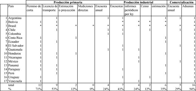 Los resultados obtenidos señalan que la totalidad de los países cuantifican la producción de madera en rollo (en metros cúbicos) que se extrae de los bosques, naturales y plantados, con diferentes niveles de precisión. El segundo producto de importancia, en términos de cuantificación, es la producción de combustible de madera, donde 10 de los 17 países realizan estudios periódicos tendientes a identificar la cantidad de madera destinada al consumo energético doméstico e industrial. En menor medida, se cuantifica la producción de postes y carbón, siendo Argentina, Chile, México, Paraguay y Uruguay los únicos países que poseen estadísticas al respecto.