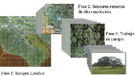 Ya con la conceptualización y la clasificación de AFB desarrollada, se procedió a preparar un diseño preliminar para el muestreo. En este diseño, se pensó en la utilización de tres fases o fuentes de información, la fase 1, se define como la utilización de imágenes de satélite, como por ejemplo Landsat, de las cuales se procederá a realizar una clasificación Landsat. En la fase 2, la utilización de sensores remotos de alta resolución será el tema principal, y por último, una fase de campo para realizar el muestreo.