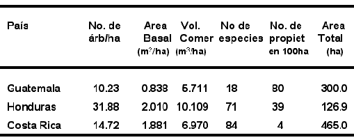 Algunos resultados preliminares, arrojados de los datos de los 10 sitios de estudio en Costa Rica, Guatemala y Honduras. En este se puede apreciar que la abundancia, área basal y volúmen de AFB por hectárea en los sitios analizados, es poca si la comparamos con bosque, pero se debe recordar que en el caso de centroamérica el área de AFB, es de alrededor de un 43 %, lo que nos hace ver la importancia de este recurso. Otro factor importante de observar, es el número de especies encontradas, esto denota de alguna forma la importancia en biodiversidad que posee este recurso.