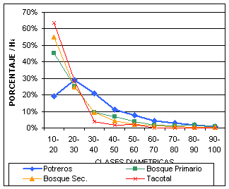 Otros resultados preliminares, interesantes de citar, son los expuestos en la figura, en ella se aprecia la tendencia de “jota invertida” que nos indica la posible sostenibilidad del bosque, en el caso del bosque primario, bosque secundario y tacotal, no así en la información de AFB, en la gráfica del porcentaje de la abundancia, se observa una disminución importante en la abundancia de árboles en las clases inferiores en los árboles fuera del bosque.