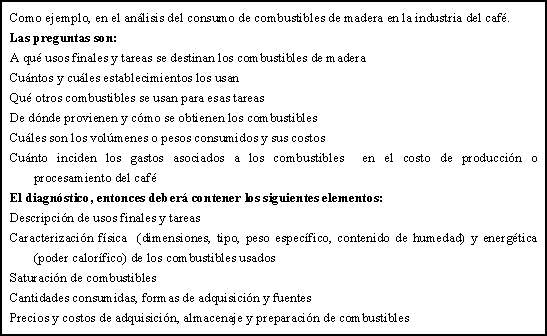 La secuencia lógica para llegar a un diagnóstico de la demanda, oferta y abastecimiento de dendrocombustibles, independientemente de la escala a que se lo plantee, incluye una serie de etapas necesarias. Las preguntas básicas que se plantean en cada etapa son: