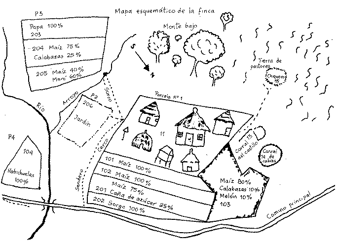 Una de las herramientas utilizadas en la entrevista, que también constituye un medio importante para registrar información, es el mapa esquemático de los predios ocupados por el hogar y de su tenencia. Es una variante del mapa esquemático que se utiliza normalmente en los censos agrícolas. En la página siguiente se presente un mapa del censo agrícola de Suazilandia. Rotulando las áreas de tierras de acuerdo con la clasificación local de tenencia se lo puede convertir en un mapa de tenencia. Por cuanto es una herramienta para la comunicación y pocos agricultores habrán podido visualizar su propiedad agrícola de esta manera anteriormente, la creación de ese mapa esquemático puede generar un gran interés. Dicho mapa es indispensable cuando se trabaja con hogares cuyos predios tienen más de dos o tres parcelas .