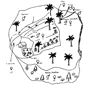 Este método visual del mapa esquemático puede emplearse también para explorar la dinámica interna del hogar. Es frecuente que los hombres y las mujeres en un hogar tengan derechos y deberes muy distintos con respecto a la tierra y los árboles. Rocheleau ha preparado una serie de mapas que emplean los términos «deberes», «control» y «trabajo» para describir los derechos y deberes de los hombres y mujeres de un hogar para con los árboles en cada parcela. En las páginas siguientes se presentan ejemplos de la República Dominicana, India y Zambia. Este autor se encuentra satisfecho, en general, con una codificación establecida en función de la autoridad para aprovechar esos recursos, el deber de proporcionar mano de obra y el derecho de disponer del producto. Los mapas de Rocheleau especifican el género, distinción que puede ser importante, según lo veremos en los próximos dos capítulos. Desde luego, estas taquigrafías para los mapas esquemáticos no pueden sustituir una especificación minuciosa del ámbito de los derechos de cada miembro del hogar sobre las tierras y los árboles.