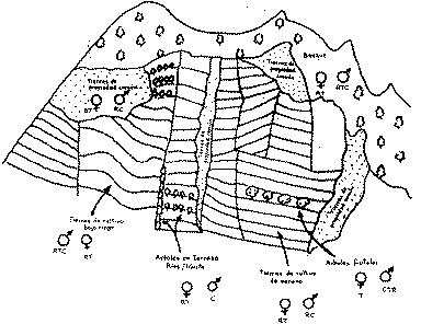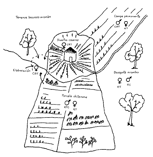 Nichos espaciales en el paisaje rural Patrones visibles de paisaje son un excelente punto de partida para determinar la distribución espacial de los dominios de hombres y mujeres y los posibles nichos para tecnologías agroforestales compartidas, separadas o entrelazadas. Dada la diversidad cultural y ambiental de los sistemas de uso de la tierra y el carácter dinámico de los ciclos de desarrollo de la comunidad y del uso de la tierra, muy poco puede asumirse en cuanto a cuáles serán los nichos a ser usados, manejados, compartidos o poseídos por las mujeres. Mientras los cercos vivos son la mejor oportunidad para las tecnologías agroforestales de las mujeres en algunos lugares de Kenya, los linderos externos son de exclusivo dominio de los jefes varones de familia entre los grupos de vecinos. En algunos casos las mujeres aún manejan de manera separada las parcelas para su alimentación y para los cultivos comerciales que son de su propiedad y, aun más, otros hombres y mujeres cultivan y cosechan plantas separadas en los mismos sistemas agroforestales de pisos múltiples. Aunque no hay nichos universalmente utilizados y manejados por mujeres, hay algunos espacios que son a menudo de su dominio. Podría parecer raro que las áreas más importantes para las mujeres son típicamente aquellas cercanas a la casa y las más lejanas. Los huertos caseros están localizados cerca del centro de la actividades familiares, en tanto las zonas de recolección comunal (árboles, arbustos y pastos) están casi generalmente fuera de la periferie del hogar, las tierras de cultivos o de todo el asentamniento, dependiendo de la población y de la intensidad del uso de la tierra (Raintree y Warner, 1985). Mientras los huertos cercanos están situados de tal forma que minimicen el tiempo fuera del hogar, la ubicación distante de las áreas de recolección de uso común en la periferie minimiza el costo de oportunidad de la tierra y los aportes reales en mano de obra y manejo en el sitio. Dianne E. Rocheleau, «Women, Trees and Tenure: Implications for Agroforestry» en Whose Trees?: Proprietary Dimensions of Forestry, eds. Louise Fortmann and John W. Bruce (Boulder: Westview Press, 1988), en pag. 260. |