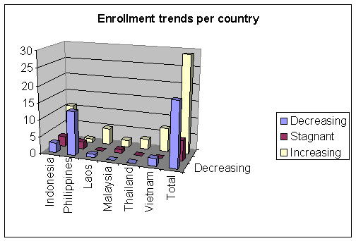 Note: Enrollment trends per institution for the Philippines was not provided, however total certificate enrollment in the Philippines decreased very sharply from 1993 to 2002 (915 and 260, respectively)