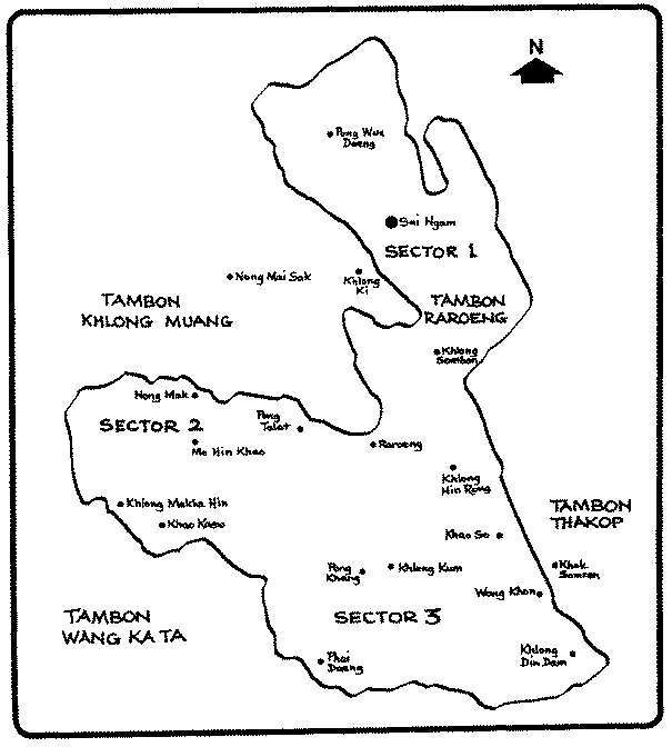 The project site was divided into three sectors, Sector I in which the project field headquarters was located (in Sal Ngam Village) comprising the northern arm of the area, and Sectors II and III covering the eastern and western portions respectively of the southern section of the area (see Map 3). This arrangement facilitated contact with the population and contributed to better monitoring of project activity by the Deputy Field Project Directors who were based in the field offices of each of the three sectors. The arrangement also made It possible to plan project activity more realistically and deal with the unique characteristics of each sector. During the course of the project, two other offices were added in more remote locations. Communication was maintained between the field offices and field headquarters and between the field headquarters and the Korat office of the project in the compound of the Divisional Forest Office through the use of twoway radio equipment as there was no telephone service.