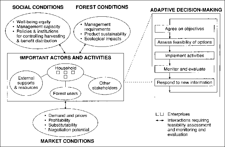 The first addition assumes that the enterprise is situated within the household economy (or a set of household economies) and that it can coexist with other enterprises and economic activities that are pursued by members of the household. Secondly, the household economy and enterprise activities are influenced by other stakeholders. These stakeholders may include other forest users, governmental agencies involved in other developmental projects, and groups that have a stake in forest resources. The forming of alliances with these stakeholders can lead to reduced competition for forest resources and also the transfer of knowledge and technology. Thirdly, it incorporates an adaptive decision-making loop to the enterprise system. The process is based on information drawn from feasibility assessment and monitoring and evaluation activities. The final addition involves the assignment of priority areas for the collection of information especially those pertaining to social, forest and market conditions.