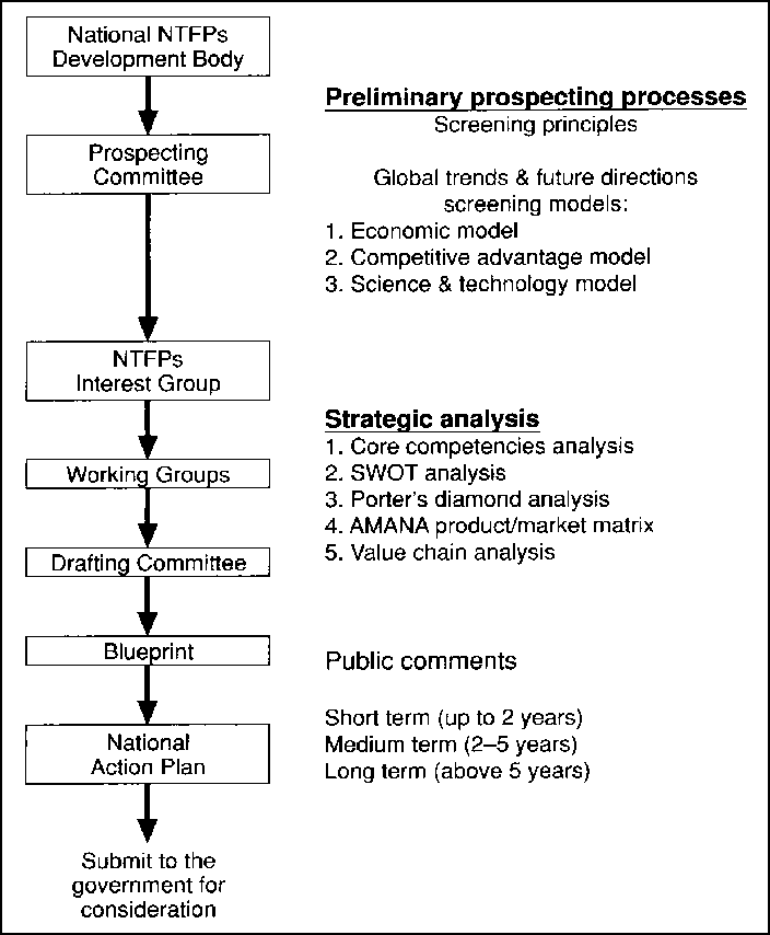 There is a need to address NTFP development in a holistic approach and the enterprise system is only a subset of the whole framework. This calls for the development of a blueprint and national action plan for potential NTFP development. The Malaysian-Industry Government Group for High Technology (MIGHT) Herbal Products Blueprint approach can be adapted and used to develop a national action plan which outlines the actions needed to be taken in the short, medium and long term. The overall outline is shown in Figure 2.