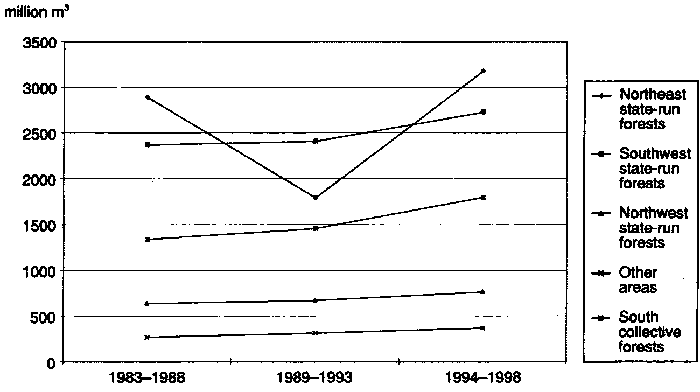 There were two components of the state-owned forests: one part of the forests was in the state-owned natural forest areas and was concentrated in large areas mainly in the northeast (Heilongjiang and Jilin Provinces, and Inner Mongolia Autonomous Region), southwest (Sichuan and Yunnan Provinces) and northwest (Shaanxi Province and Xinjiang Autonomous Region, Gansu and Qinghai Provinces); the other part of the forests was the state-owned forest farms and nurseries set up with the investment of the government in the large, concentrated and barren mountainous areas or in sparse forest areas in all provinces. Since the founding of new China, the state-owned forests with very good resources have been the major suppliers of logs in large diameters. At the same time, the state-owned forests had very important ecological positions since they were mainly located at the source of rivers. However, during the last 20 years, the state-owned forest resources decreased sharply. The timber production, accounting for 63 percent of the national timber production at the early stage of the founding of new China, decreased to nearly 30 percent at present. According to the results obtained from the fourth national forest resource inventory (1989-1993), in the northeast state-owned forest areas, 277 000 ha of the forest area and 17.79 million ha of standing stock volume decreased annually, and half of the forest resources that could be harvested decreased. Among 82 forestry bureaus, 31 had no forests to be harvested (Liu 1996). The direct reason of exhausted resources was overcutting of forests. In the state-owned forest areas, the overcutting of forests was annually 20 million cubic meters (Liu 1999). By the year 2000, the resources in 90 forestry bureaus among 135 state-owned forestry bureaus were exhausted (Zhang 1998).