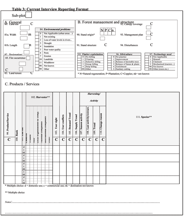 One possible way of defining user groups is to group them according to their legal rights to harvest the product or service in question. The suggested format in Table 4 below offers one possible typology for such a classification, but each country needs to agree on how to classify user groups, whether they want to differentiate according to legal rights, ethnic groups, gender, age, or perhaps family income. Once the user group has been defined, information about each group's use of products and services in a particular land use section is recorded. according to the suggested new format in Table 4. Drawing on interview information, field personnel are asked to estimate the number of harvesting households and the quantities of the harvested products and services from each land use section (LUS). New in this suggested format is also the elimination of the categories that seem superfluous to the goals of the FRA 2005, such as the as the date of the last extraction, future trees expected and future trees desired.