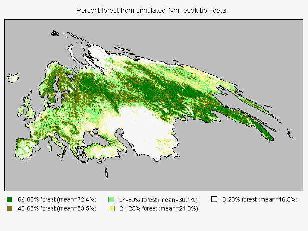 The statistical efficiencies of alternative sampling designs are affected by the detailed spatial structure of regional and local landscape patterns within a population. The FRA 2000 global forest cover map (FAO 2001) for Europe and CIS was used to add this spatial realism into the hypothetical population. The FRA 2000 map uses 1-km cells classified into one of five categories (Table 12). This map is a modification (Zhu and Waller 2001) of the Global Land Cover Characteristics Database (Loveland et al. 1999) produced by the USGS Eros Data Center.