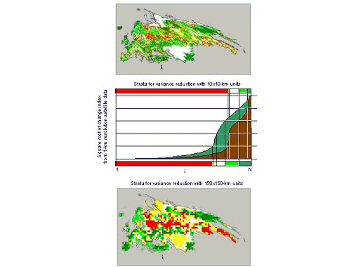 Optimal boundaries for each sub-stratum were formed using methods recommended by Cochran (1977:127-131). First, consider sub-strata optimised to estimate change in forest area over 10-years with the 150x150-km Large Sampling Units (LSUs). For each sampling unit, AVHRR data from 10-years apart are used to estimate the change in forest area (km2). (The methods used to simulate multi-date AVHRR data in this analysis are given above). AVHRR estimates have significant bias caused by misclassification errors (Czaplewski 1992). However, estimates from AVHRR are correlated with estimates from Landsat and Ikonos. Since AVHRR estimates are available for all N sample units in the population, AVHRR data can be used to define the boundaries of sub-strata for all sample units.