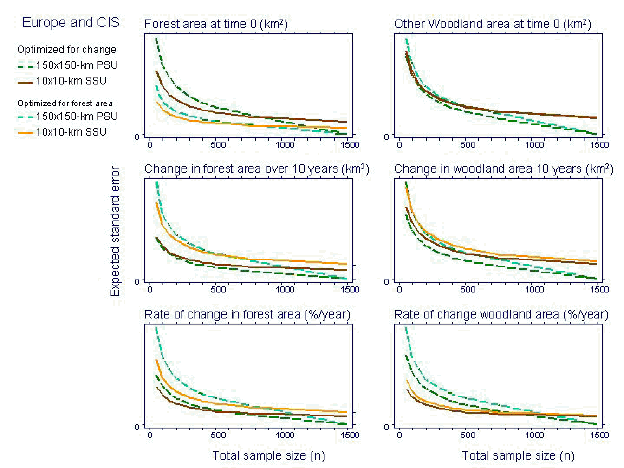 Figure 6 summarizes the results for Europe and CIS. The standard error with the 150x150-km LSUs approaches zero as n approaches 1473 because of the finite population correction factor. As expected, the sub-strata boundaries optimized for forest area (using AVHRR estimates at time 0) produces more precise estimates for forest area as determined with Landsat and Ikonos data. Likewise, sub-strata boundaries optimized for changes in forest area (using AVHRR estimates at time 0 and time 10) produces more precise estimates for changes in forest area as determined with Landsat and Ikonos data.
