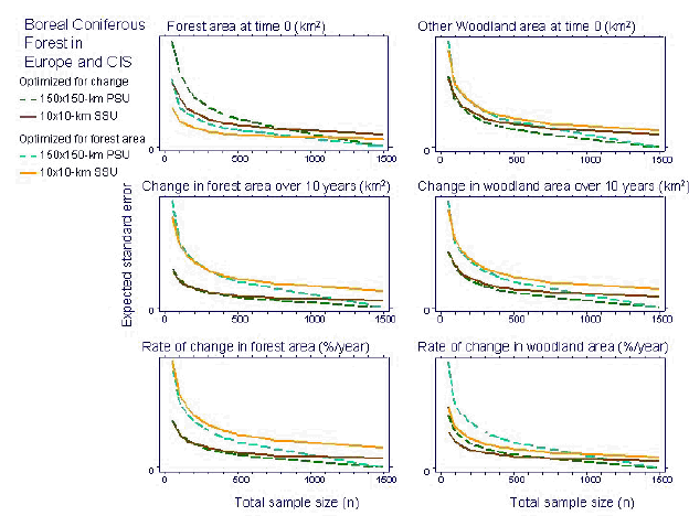 Figure 7 presents similar results for one of the ten ecological zones: Boreal Coniferous Forest. This Zone has the highest rate of change among all ecological zones in the hypothetical population. The sample size n in Figure 7 represents the entire sample size for Europe and CIS, and only a portion of these n samples is allocated to the Boreal Coniferous Forest zone.