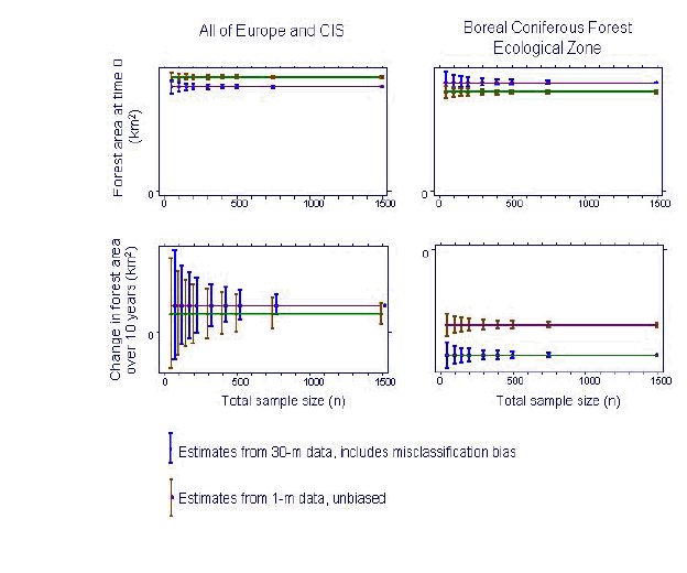 Results for the large 150x150-km sampling units in Figure 6 and Figure 7 assume that each is measured with Landsat data, not the more accurate 1-m Ikonos data. However, there is a bias in the estimates from these large sampling units caused by misclassification. Figure 8 compares the magnitude of this bias relative to the standard error. For analyses of the entire Europe and CIS region, the bias in estimated forest area at time 0 is significant except for very small sample sizes (n<75). The significance of this bias is somewhat less when analyzing a single ecological zone, but becomes significant in this example with a total sample size of n>300. The bias is insignificant for estimates of changes between time 0 and time 10 for Europe and CIS, largely because the net change at this scale is only 0.16%. The bias is very notable for the Boreal Coniferous Forest zone, which has the largest loss of forest (-5.34%) among all ecological zones in this hypothetical population. The conclusion is that bias caused by misclassifications with Landsat data, relative to 1-m Ikonos data, can be large enough to be a concern for FRA 2010.