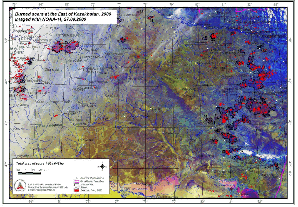 Figure 3-7 Forest and steppe area burned in Kazakhstan during the fire season 2000 (date of satellite image: 29 September 2000).
