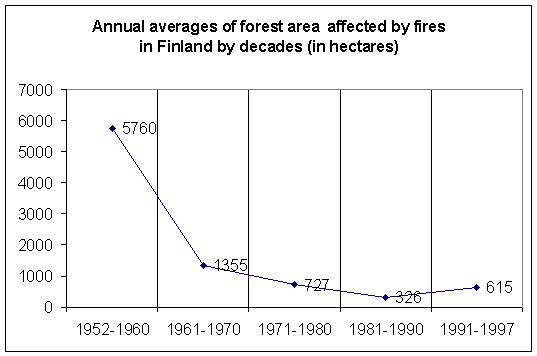 Property and the environment are mainly at risk from forest fires in Finland. All in all, forest fire damage in Finland has been very low indeed, i.e. less than 10 million Finnish Marks per year. There is no significant damage to ecology or public health.